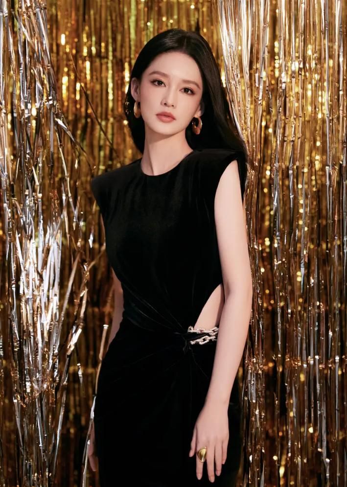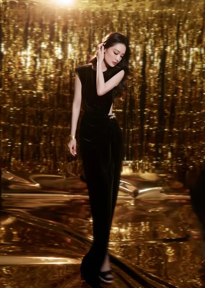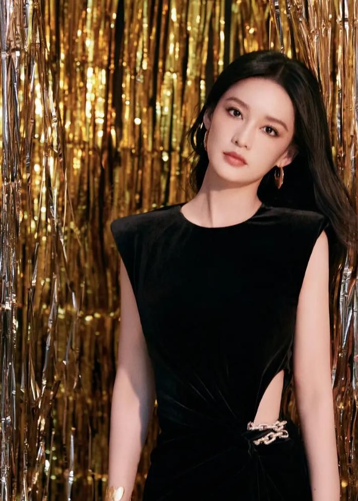 在闪耀着璀璨光芒的背景下,身穿黑裙的李沁,颜值在线,身材曼妙,肤色白皙,简直可以说是一位完美的无可挑剔的小仙女!